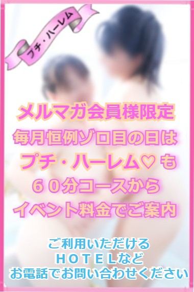 お店から | ~秋のイベント~ 10/10(金)~10/13(月) イベント開催中ご来店の方全員に 使用期限無し『割引チケット』進呈 【イベント料金】 ◇ 60分--(鶯谷限定)10,000円 ◇ 80分--20,000円→14,000円 ◇100分--25,000円→19,000円 ◇120分--30,000円→24,000円 【プチ・ハーレム料金】 (通常プチハーレム割引) ◇ 60分---20,000円→→19,000円 ◇ 80分---28,000円→→27,000円 ◇100分---38,000円→→37,000円 ◇120分---48,000円→→47,000円 ※ロングコースは、100分・120分との 組み合わせでご利用ください ※60分のダブル・トリプルは、 ご利用頂けません ※他のイベントとの併用は、出来ません ☆~☆~☆~☆~☆~☆~☆~☆~☆ ◇本日・10/10(金)一日限定◇ 【メルマガ会員様限定】 今回~秋のイベント~は 毎月恒例メルマガ会員様限定 【ゾロ目の日イベント】と かさなるため 本日・10/10(金)ゾロ目の日一日限定 メルマガ会員様のみの 特別割引のご案内です!! 【メルマガ会員様料金】 ◇ 60分--10,000円→ 9,000円 ◇ 80分--20,000円→12,000円 ◇100分--25,000円→17,000円 ◇120分--30,000円→22,000円 プチ・ハーレムも本日限定 お得に遊んでいただけるうえ 割引チケット2枚進呈♪ 是非この機会に いつもと違う刺激を味わってみませんか(^^♪ (通常プチハーレム割引) ◇ 60分---20,000円→→18,000円 ◇ 80分---28,000円→→24,000円 ◇100分---38,000円→→34,000円 ◇120分---48,000円→→44,000円 ※特別料金のため120分コースまで とさせていただきます ※ご予約の際【会員番号】を必ず お電話でおっしゃって下さい (女性がお部屋に伺ってからの申告は、 無効となります) ※60分のダブル・トリプルは、 ご利用頂けません ※他のイベントとの併用は、出来ません |