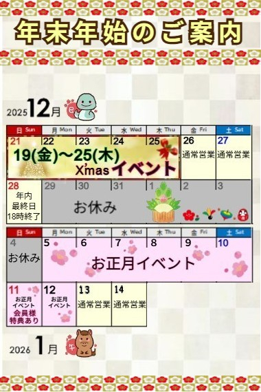 | お店から | 【年末年始のご案内】 12月28日(日)・年内最終営業日 (17時最終受付18時終了) 1月5日(月)・新年営業初日 (通常営業時間) --------------------------------------- 【クリスマス・イベント】 12月19日(金)~12月25日(木) ◇24日(水)・25日(木)の2日間は 『有効期限なし割引チケット進呈』 ------------------------------------- 【お正月イベント】 1月5日(月)~1月12日(月) ------------------------------------- ※60分コースは、鶯谷限定となります ※ロングコースは、100分・120分との 組み合わせでご利用ください ※60分のダブル・トリプルは、 ご利用頂けません ※他のイベントとの併用は、出来ません ※ご予約の変更・キャンセルは 極力ご遠慮頂きますよう 宜しくお願い致します ご予約お待ちしております(^^♪ |